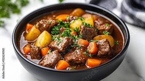 A hearty beef stew in a black ceramic bowl, showcasing tender meat chunks and colorful vegetables garnished with parsley, embodying comfort food aesthetics against a white marble tabletop.