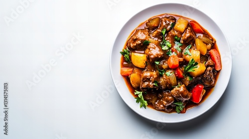 A hearty beef stew, rich in color and flavor, served in a white bowl. Perfect for a cozy meal.