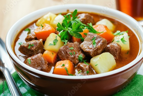 A hearty bowl of beef stew filled with vegetables, perfect for a comforting meal.