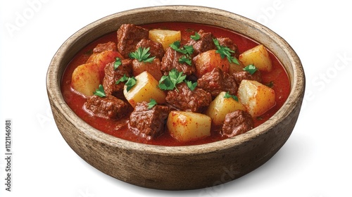 A hearty bowl of beef stew with potatoes, garnished with parsley.