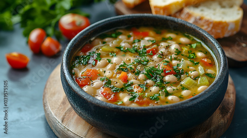 A hearty bowl of Fasolada, the traditional Greek white bean soup, with tender beans, carrots, celery, and tomatoes, simmered in olive oil and herbs, and served with crusty bread