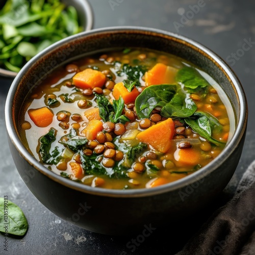 A hearty bowl of vegetable soup with lentils, carrots, and spinach. Featuring a warming, nutritious dish