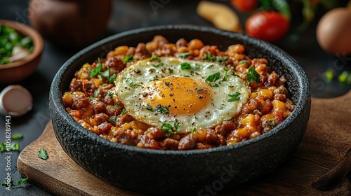 A hearty dish featuring beans and a fried egg, garnished with herbs.