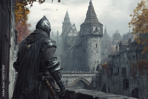 A heavily armored knight stands overlooking a medieval town, cloaked in mystery and history, reflecting the noble past from a stone bridge amid autumn foliage.