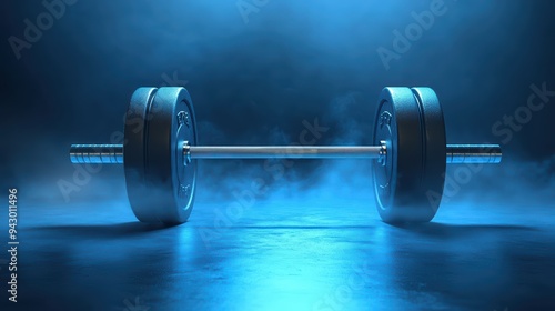 A heavy barbell rests on dark surface, surrounded by misty blue light, conveying strength and determination.