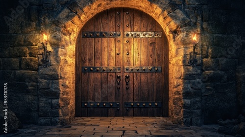 A heavy wooden door with iron studs, leading to a medieval castle, with a torch-lit path visible just beyond the entrance.