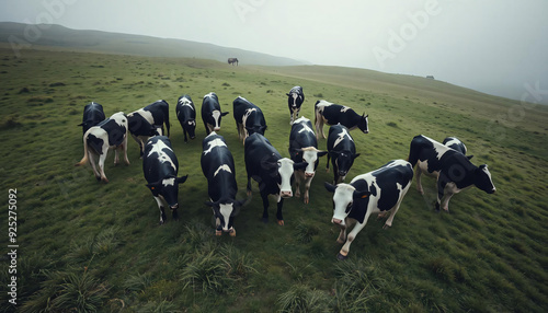 meadow, farmland, aerial view, outdoors, farm animal, head, green, milk, nature, grass, field, pasture, herd, dairy, cow, cattle, agriculture, landscape, standing, ranch, straw, summer, sunny, sunset, village, mammal, white, rural, pastoral, land, countryside, herb, animal, background, beast, black, bovine, country, beef, domestic, europa, farm, farming, graze, grazing, group, eating