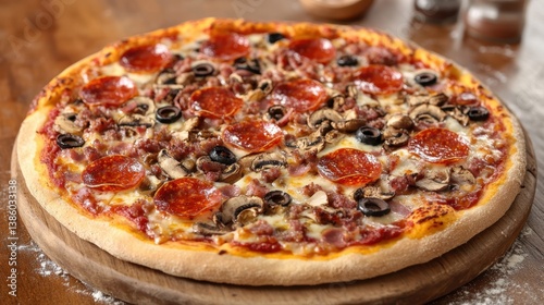A high-angle view of a freshly baked pizza with various toppings like pepperoni, mushrooms, and olives, on a rustic wooden table, on a white background