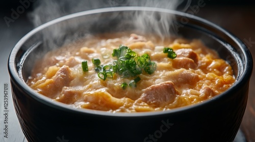 A high-detail shot of freshly cooked oyakodon in a black lacquer bowl, with steam rising from the warm dish.