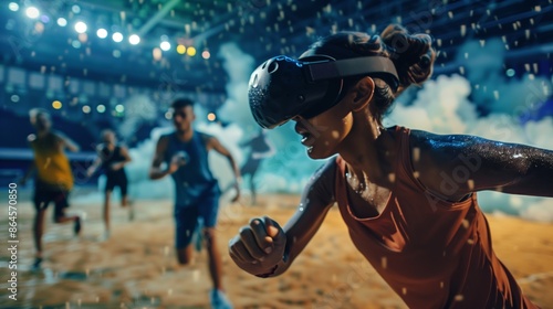 A high-energy VR sports event where participants compete in a vivid, realistic stadium atmosphere.