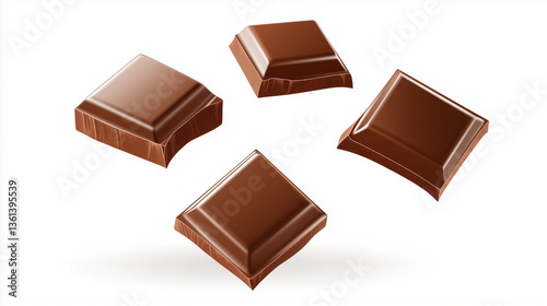 A high-key close-up studio shot depicts four milk chocolate pieces seemingly levitating against a pure white background. Each square piece of chocolate displays a smooth, glossy surface with subtle
