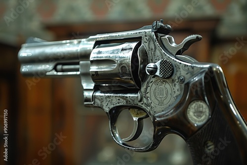 A highly detailed, close-up shot of a vintage revolver showcasing the intricate engravings on its metal surface, set against a softly focused, antique-themed background