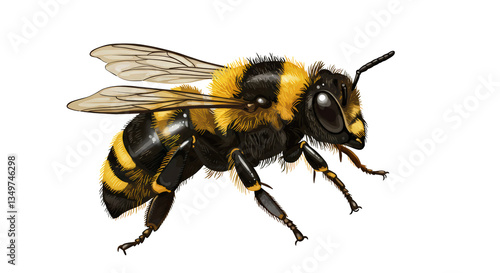 A highly detailed honey bee or bumblebee, isolated on a transparent background, showcasing its delicate wings, fuzzy body, and intricate anatomy, perfect for nature and pollination-themed designs.