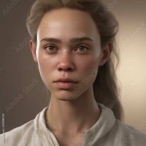 A highly detailed, hyper-realistic close-up portrait of an AI-generated human face. This digital artwork features lifelike skin textures, expressive eyes, and natural lighting.