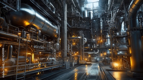 A highly intricate industrial facility filled with metal pipes, machinery, and infrastructure, highlighting modern engineering, manufacturing, and technology.