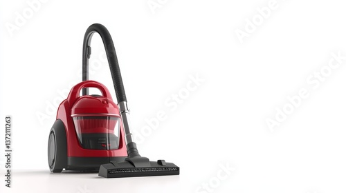 A high-powered vacuum cleaner standing upright with attachments, isolated on a white background,