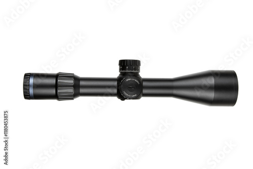 A high-quality black rifle scope with multiple adjustment knobs, precision optics, and a sleek design