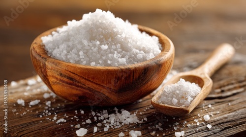 A high-quality image of a cooking salt bowl with a sprinkle of salt crystals on a wooden surface, illustrating the ingredient's texture and natural form.