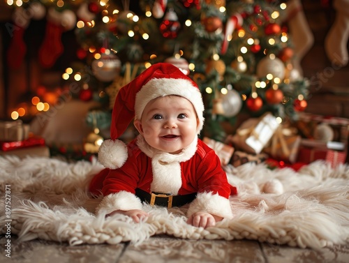 baby, santa, claus, outfit, christmas, tree, decorated, warm, twinkling, light, ornament, magical, background, soft, lighting, cosy, festive, atmosphere, camera, detailed, texture, tone, sharpened, natural, decoration, holiday, spirit, joyful, adorable, seasonal, cheerful, family, celebration, indoor, scene, expressive, charming, inviting