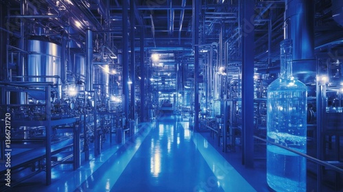 A high-tech chemical plant with interconnected pipes and glowing fluids.