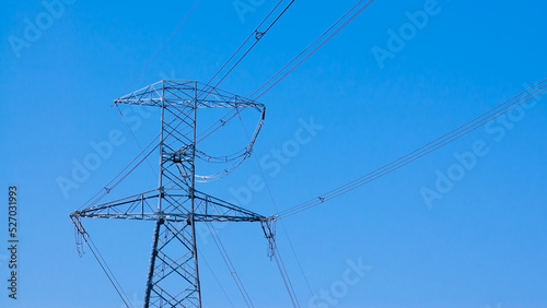 a high-voltage power transmission line, in the photo, a power line support against a blue sky