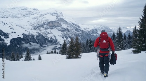 A hiker in a bright red jacket walks along a snowy trail surrounded by tall evergreen trees and majestic mountains. The picturesque winter scenery enhances the adventure spirit