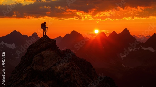 A hiker silhouetted against a vibrant sunset over majestic mountains.