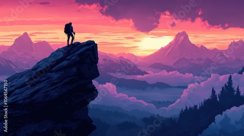 A hiker stands on a mountain peak, looking out over a vast, misty valley. This image captures the feeling of accomplishment and the beauty of nature.