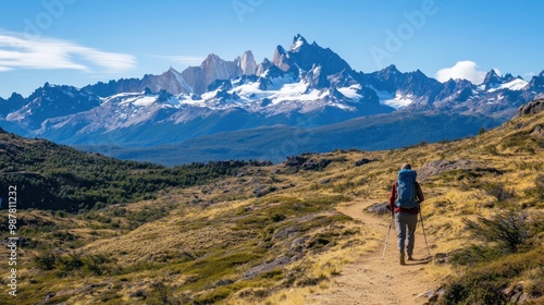 A hiker traverses a scenic mountain trail with snow-capped peaks in the background.