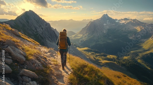 hiker, mountain, alps, sunset, trail, landscape, sky, cloud, rock, grass, peak, vale, nature, adventure, travel, wilderness, scenery, panoramic, view, horizon, gold, light, shadow, path, trek, journey, expedition, exploration, freedom, solitude, serenity, peace, calmness, beauty, majestic, breathtaking