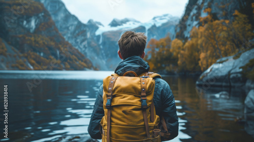 A hiker with a yellow backpack gazes at a serene lake surrounded by towering mountains and autumn foliage, reflecting the peaceful landscape.