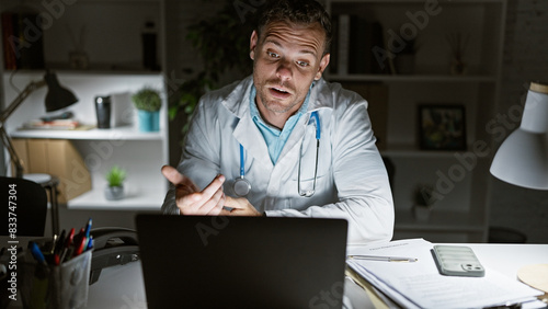 hispanic, doctor, clinic, office, night, video, call, male, gesture, indoor, health care, professional, medicine, man, adult, physician, scrub, stethoscope, medicals, consultation, teamwork, technology, working, laptop, online, communication, care, serious, focused, occupation, workplace, discussion, advice, hospital, webcam, uniform, lighting, interior, conversation, computer, consult, sitting, intense, desk, fatigue, expression