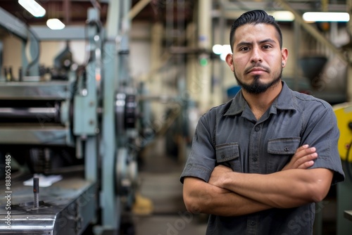 A Hispanic male factory worker stands confidently in a busy industrial setting. His arms are crossed, and he stares intently at the camera