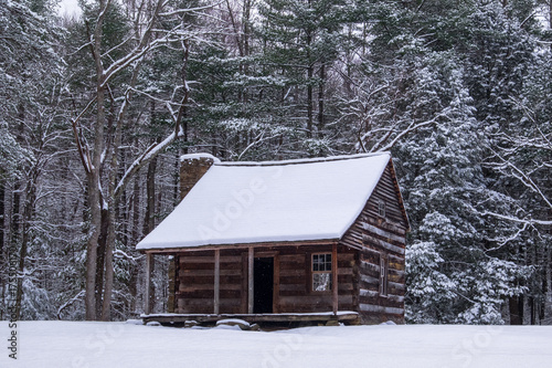 A historic cabin in the snow at Smoky Mtn Nat'l Park's Cades Cove