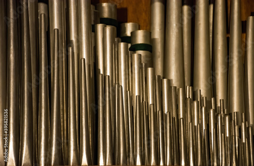 A historic pipe organ inside a church. Old musical instrument, religious music.