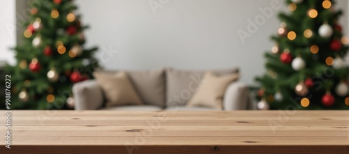 A holiday-themed mockup banner features an empty wooden tabletop with a cozy abstract Christmas scene in the background complete with twinkling string lights on a live tree and snowfall blur effects