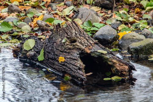 A hollow tree trunk lies in an autumn creek. A rocky shore of river with fallen leaves.