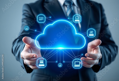 A holography depiction of a businessman holding a cloud computin