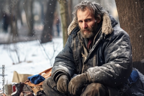homeless, man, sitting, tree, snow, winter, cold, harsh, condition, poverty, homelessness, shelter, weather, landscape, solitude, despair, destitute, unfortunate, snow-covered, survival, social, issue, hardship, adversity, freezing, vulnerable, alone, struggle