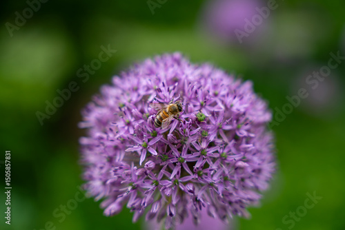 A honeybee sits on a bright purple allium flower, collecting nectar. The photo shows an impressive macro shot with a strong depth of field, emphasizing the beauty of nature and the importance of polli
