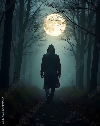 A hooded figure walks along a misty forest path, bathed in the eerie light of a full moon, creating a haunting atmosphere.