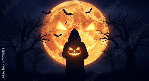 A hooded figure with a glowing jack o lantern face stands silhouetted against a massive, bright orange full moon with bats flying around it.