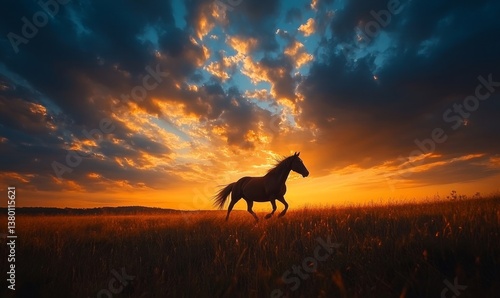 A horse silhouette running in a field at sunset, bathed in warm, golden light