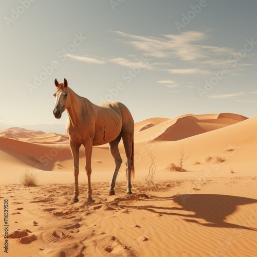 A horse standing against the background of the desert, hooves in the sand. Concept: horse breeding, ranch. Banner with copy space