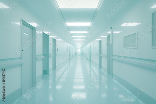 A hospital hallway with no people in a wide shot against a white background in the medical style, featuring a white and light blue color palette photographed in high resolution.