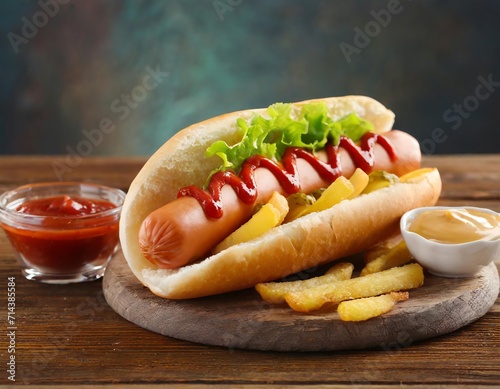 A hotdog is an iconic snack consisting of a sausage in a bun, typically adorned with various flavorful condiments and sauces. AI generation.