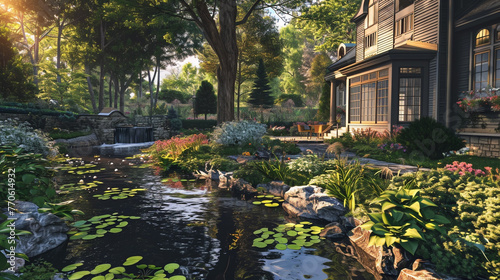 house, duck pond, lush, grass, greenery, nature, landscape, home, outdoors, calmness, peaceful, serene, countryside, rural, tranquil, scenic, idylli, beauty, garden, foliage, tree, environment, water, natural, estate, vegetation, picturesque