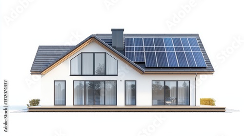 A house equipped with solar panels is depicted against a white background, showcasing its energy-efficient features and commitment to sustainable living.
