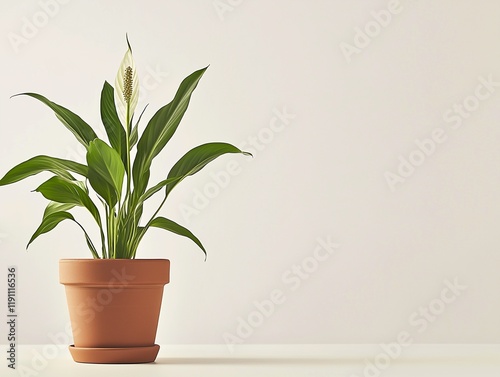 A house plant in a clay pot on a light background with soft daylight. Peace Lily. Pastel colors.