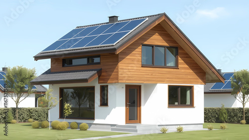 a house with a solar panel on the roof and a green lawn in front of it and a blue sky, Évariste Vital Luminais, photorealism, vray render, a digital rendering
